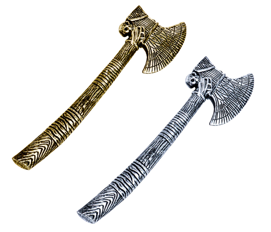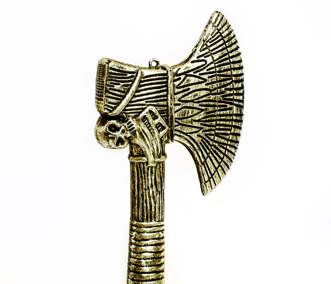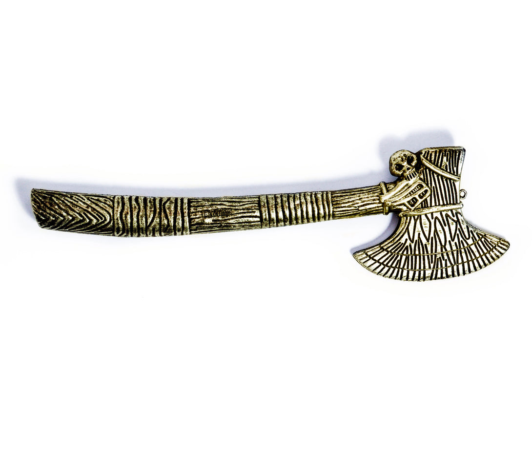 Axt mit Totenkopf aus robustem Plastik in Silber und Gold. Ideal zu Karnevalskostümen, Mittelalterfesten oder zum spielen mit Freunden. Durch die Verzierungen ist die Axt der Hingucker bei jedem Kostüm.